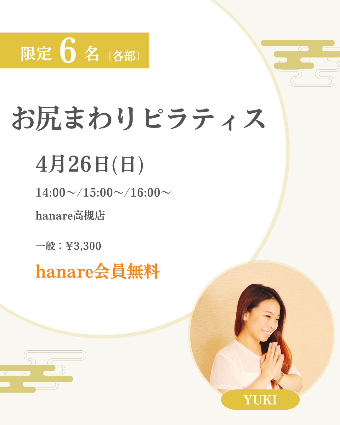 この度hanareでは、4月26日(日)にYUKIさんをお招きして「お尻まわりピラティス」を開催いたします🍃